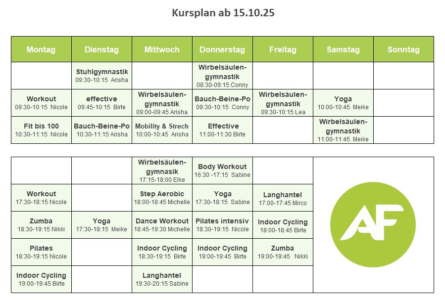 Neben der Fettverbrennung, der Gewebestraffung und der Verbesserung der Kondition steht vor allem der Spaß im Vordergrund. Unterstützt werden Sie durch unser engagiertes und qualifiziertes Trainerteam. Hier erwarten Sie tolle, abwechslungsreiche Übungsvarianten, um Ihre persönliche Fitness zu erhalten oder zu steigern.