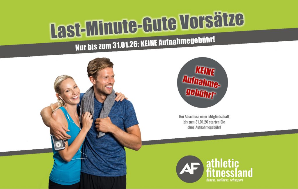 Jetzt noch schnell die GUTEN VORSÄTZE starten! Nur bis zum 31.01.26 sparen Sie bei unserem Knaller-Angebot: Bei Abschluss einer Mitgliedschaft starten Sie ohne Aufnahmegebühr! Vereinbaren Sie noch heute Ihren kostenfreien und unverbindlichen Termin für ein Probetraining oder Info-Gespräch! Wir freuen uns auf Ihren Besuch!