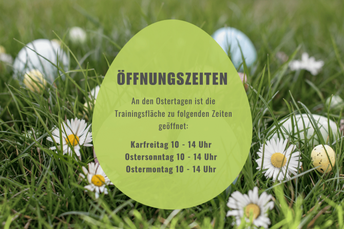 Unser Trainingsbereich ist an Karfreitag, Ostersonntag und Ostermontag von 10–14 Uhr geöffnet.